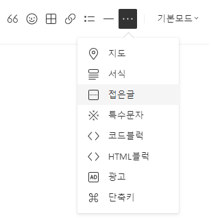 기본 접은 글은 "더보기"라는 이름으로 나타난다. 하지만 첫 줄에 @를 사용하면 아코디언 제목을 작성할 수 있다.